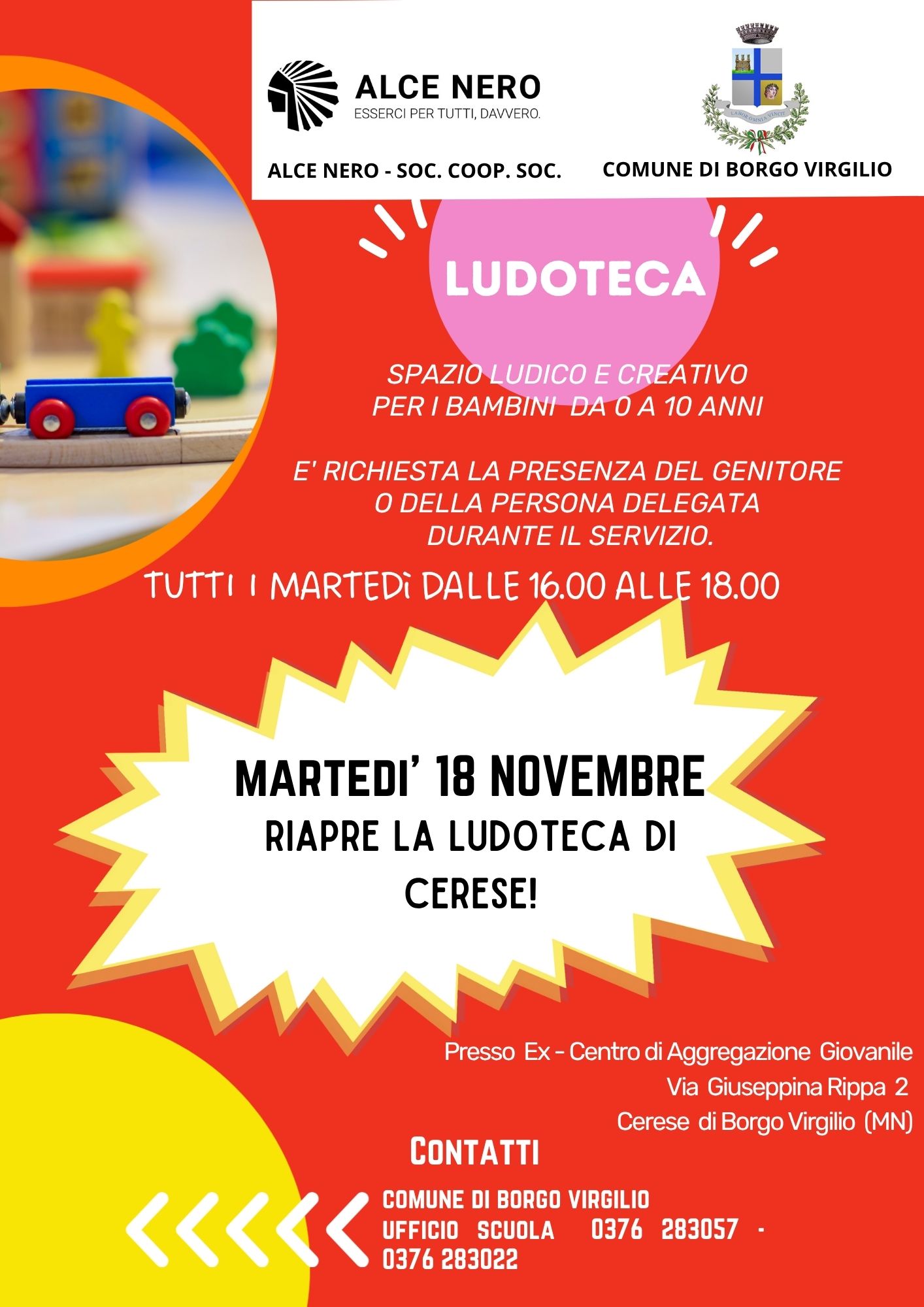 Si comunica a tutte le famiglie che dal 18/11/2025 riaprirà la Ludoteca di Cerese, servizio gratuito rivolto ai bambini dai 0-10 anni, accompagnati da un genitore o altro delegato che rimarrà presente per tutta la durata delle attività.