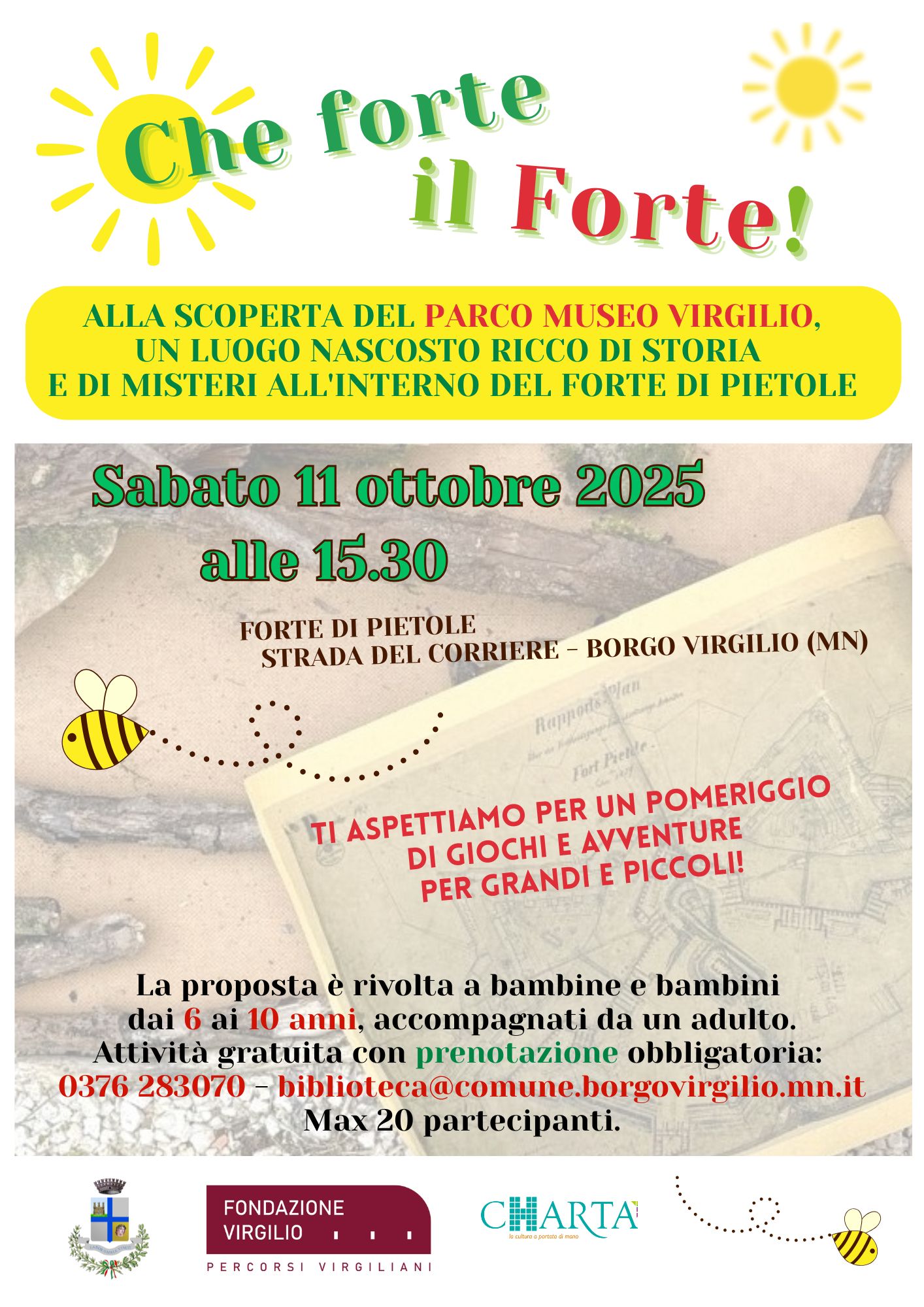Sabato 11 ottobre 2025 alle ore 15.30 presso il Parco Museo Virgilio (Strada del Corriere - Borgo Virgilio) vi aspettiamo per un pomeriggio di giochi e avventure alla scoperta del Forte di Pietole, un luogo nascosto ricco di storia e di misteri. La proposta è rivolta a bambine e bambini dai 6 ai 10 anni, accompagnati da un adulto.